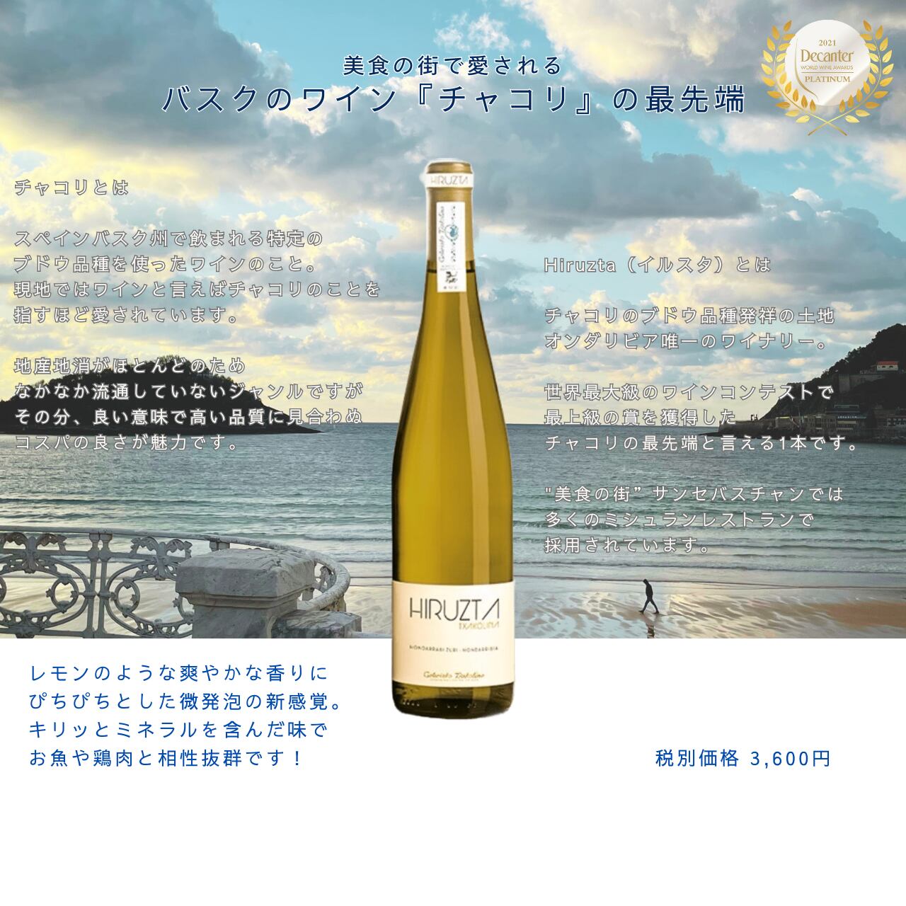 Hiruzta(イルスタ)とは チャコリのブドウ品種発祥の土地オンダリビア唯一のワイナリー。 世界最大級のワインコンテストで最上級の賞を獲得した チャコリの最先端と言える1本です。 "美食の街”サンセバスチャンでは 多くのミシュランレストランで採用されています。 メインブランドである本チャコリは レモンのような爽やかな香りにぴちぴちとした微発泡の新感覚。 キリッとミネラルを含んだ味でお魚や鶏肉と相性抜群です!